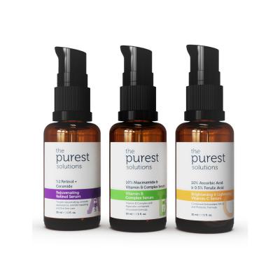 Discover the ultimate skincare solution with The Purest Solutions Skincare Serum Set, expertly crafted to rejuvenate, nourish, and brighten your skin. This comprehensive set includes three powerful serums - Retinol Serum for anti-aging benefits, Vitamin B Complex Serum for skin nourishment and barrier repair, and Brightening Vitamin C Serum for antioxidant protection and skin brightening.