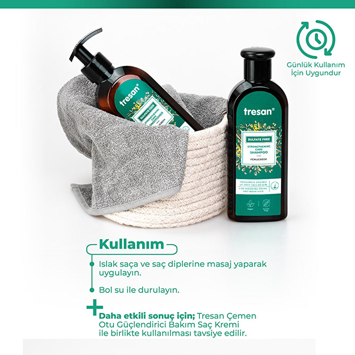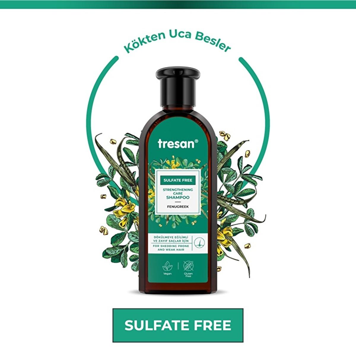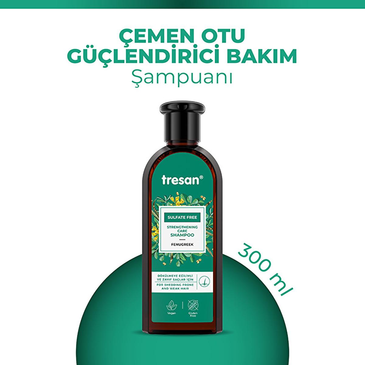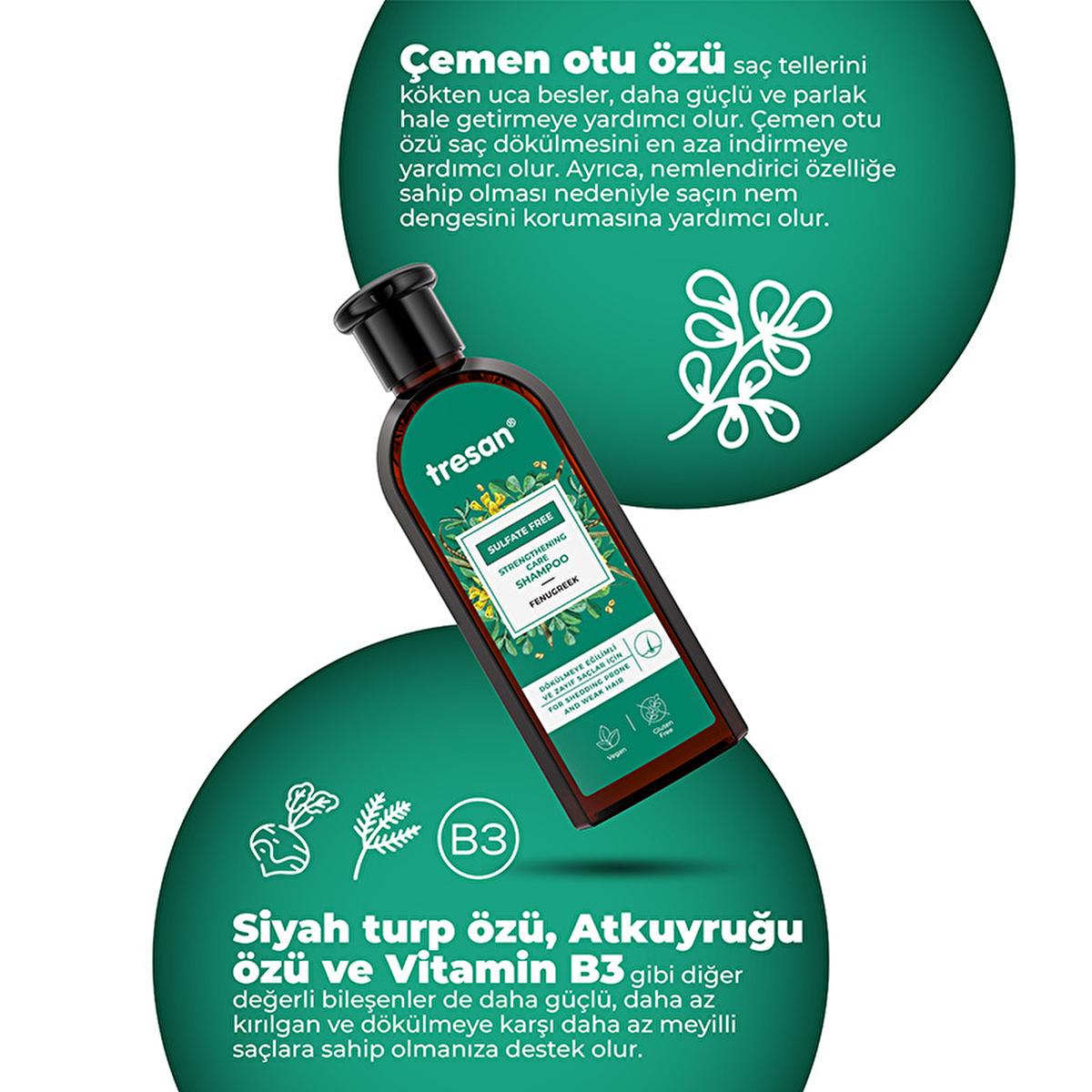Are you struggling with hair loss, thinning locks, or just looking for a gentle, effective shampoo that nourishes your hair from roots to ends? Tresan Çemen Otu Güçlendirici Sülfatsız Bakım Şampuanı is specifically designed for you. This powerful, sulfate-free shampoo harnesses the natural benefits of Çemen Otu (Fenugreek) extract, Siyah Turp (Black Radish), and Atkuyruğu (Horsetail) to provide deep care, promote hair growth, and strengthen hair strands.